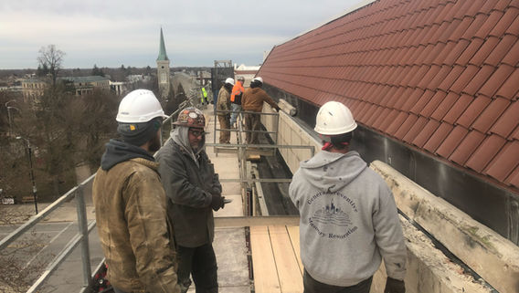 Our team restored a historic downtown Sandusky building, formerly a bank, where the upper stone wall had been held in place with temporary straps. We carefully removed the entire wall, rebuilt it, and installed all new stones to ensure lasting strength and a clean, historic appearance.