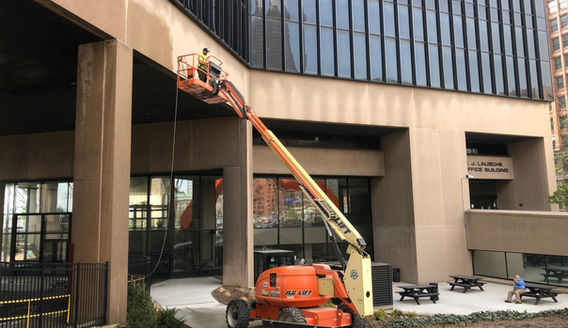 Our team completed a full restoration of the lower portion of the Frank Lausche Building. The project included exterior washing, waterproofing, caulking, securing underside panels, and finishing with a fresh coat of paint to protect and revitalize the structure.